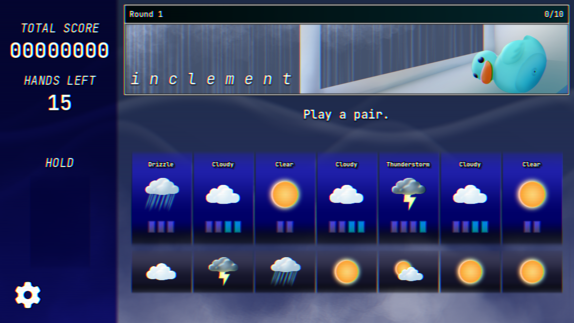 Play the hand given by the white text to earn points. The cards you play determine what the next hand will be (as shown by the icons on the bottom of the cards). The green text will preview what's next if you have a valid hand currently selected. The weather symbols below the cards are a preview of incoming cards.